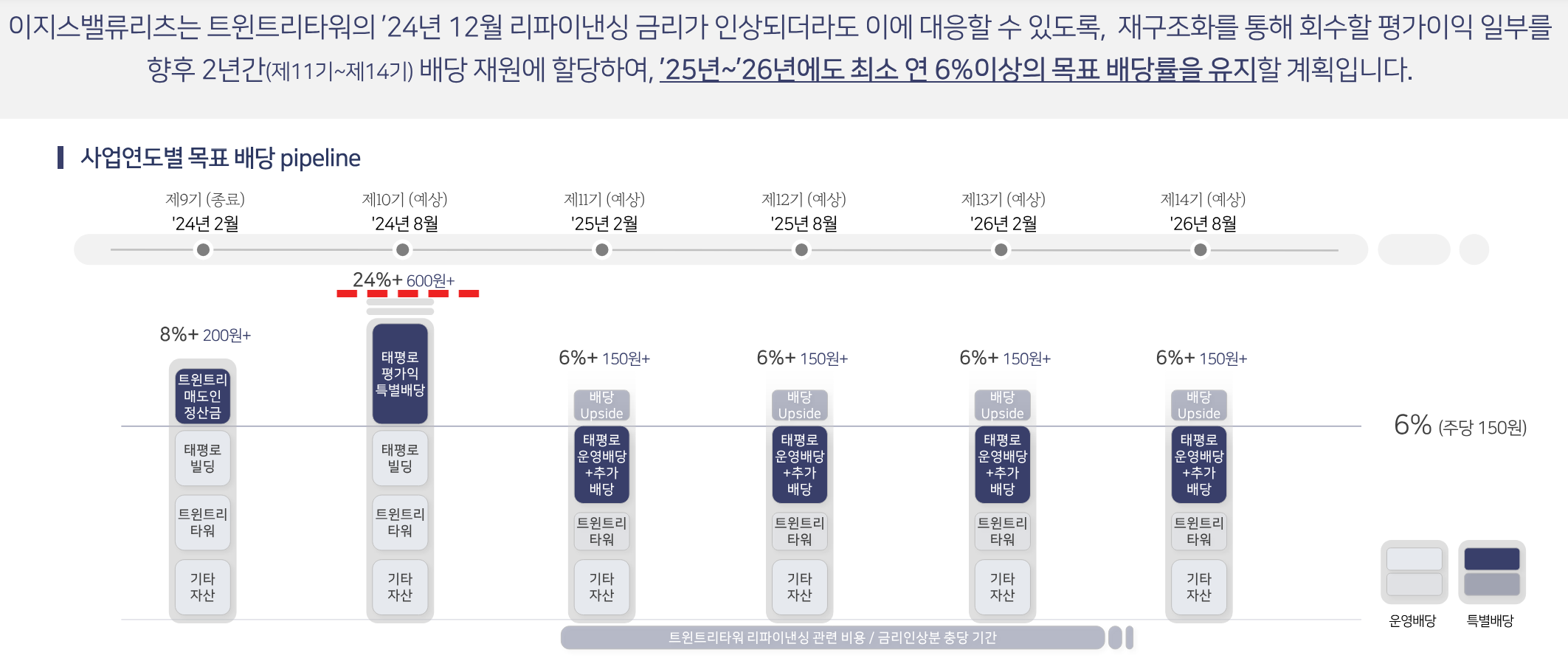 특히 이번 태평로빌딩의 자본 재구조화(Recapitalization)를 통한 평가 이익을 자산 매각 없이 실현해 특별 배당까지 추진할 계획이라고 당사 홈페이지에 공개하였습니다.