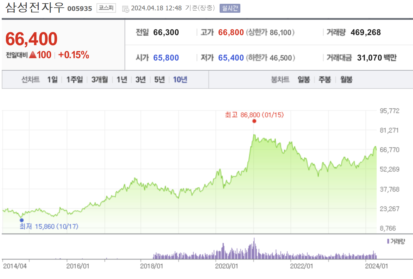 2024년 4월 18일 현재 우선주는 66400원, 일반주는 79800원이다.