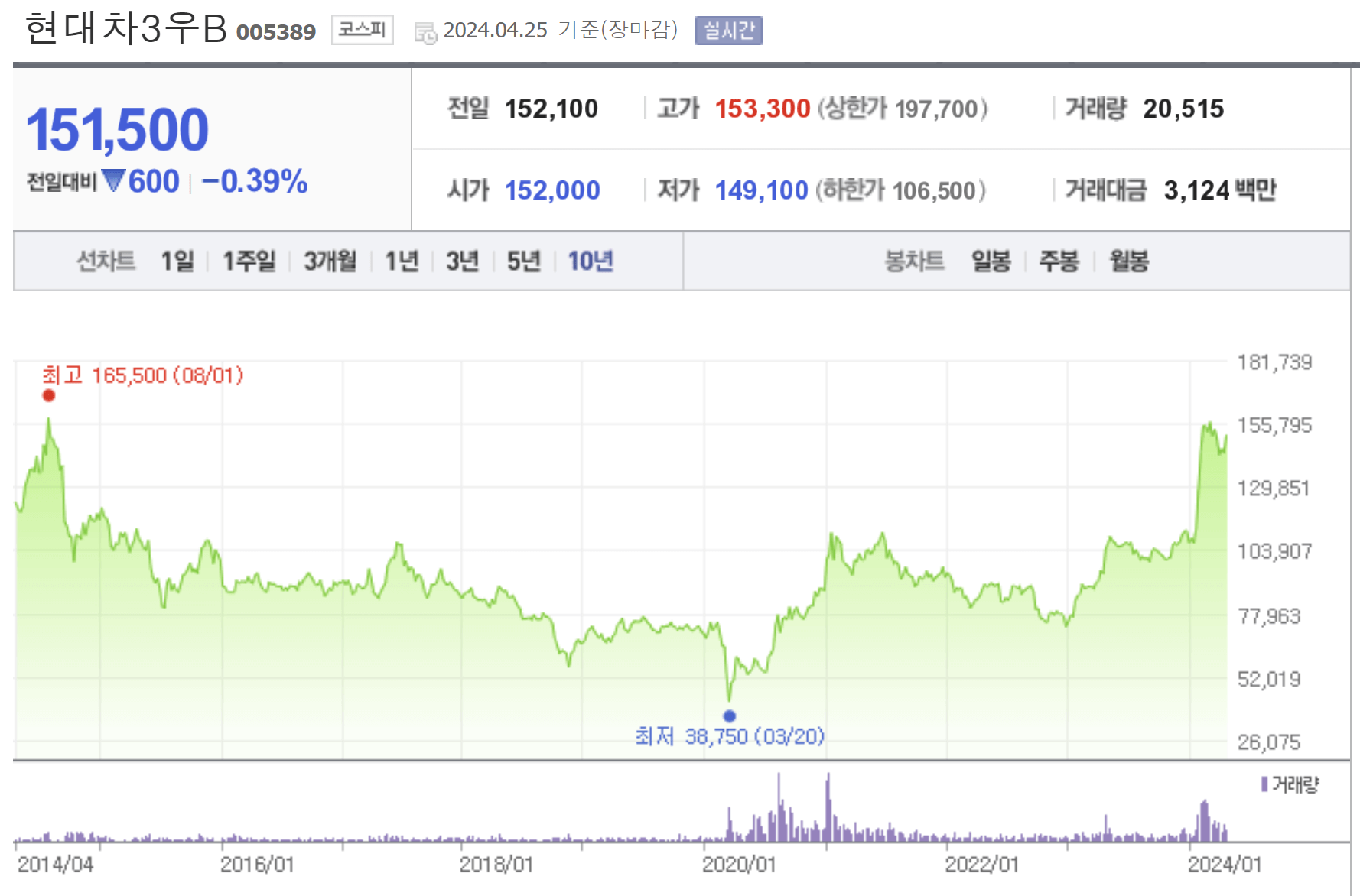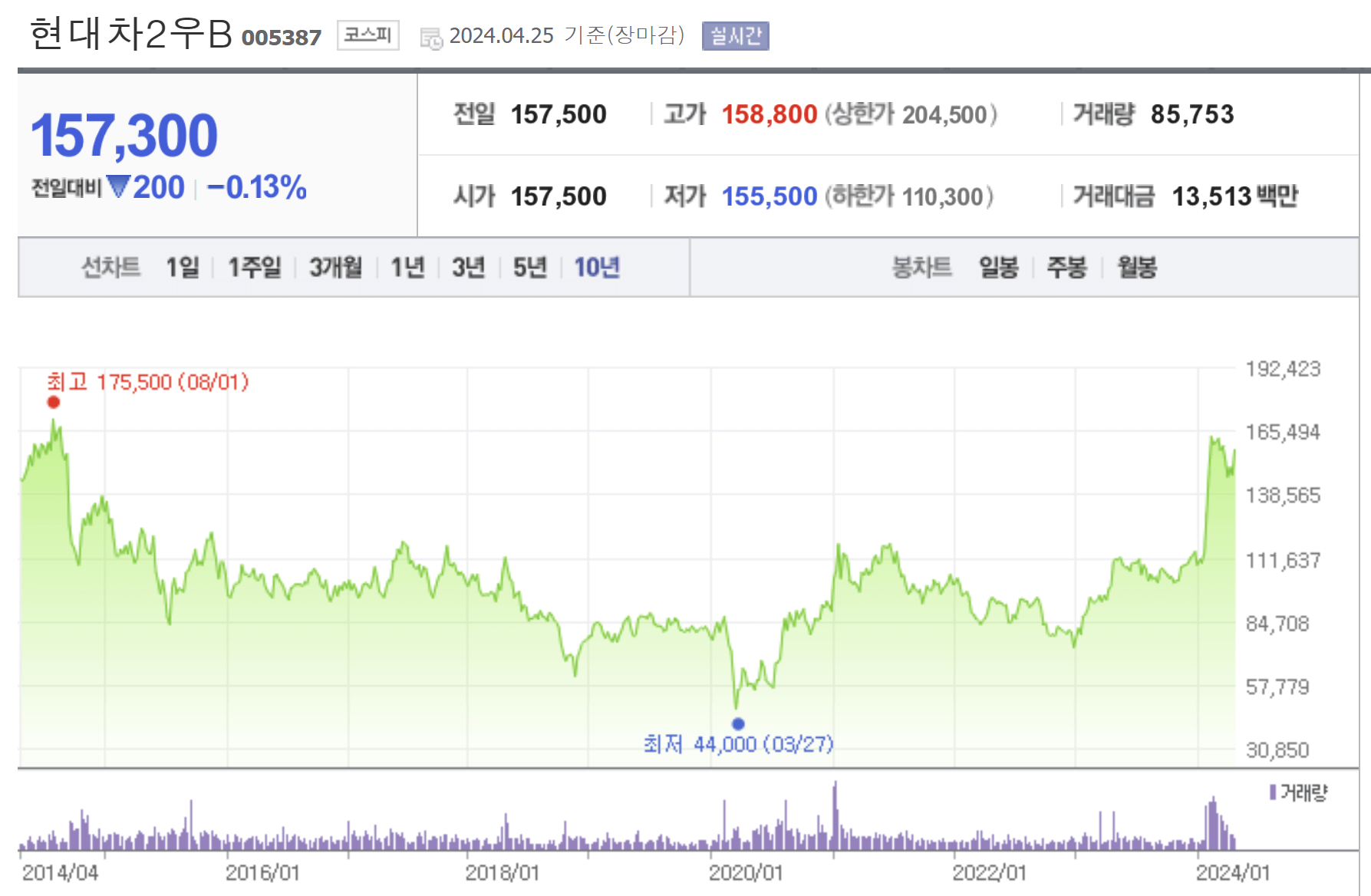 현대차 2 우 B 주식이다. 24년 4월 25일 자 현재 157300원이며, 20년 3월 27일 44000원 최저가를 14년 6월 1일 175500원 최고가를 기록했다.